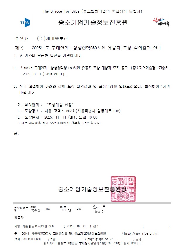 당사가 중소기업기술정보진흥원 주관의「2025년 구매연계·상생협력형 R&D사업 유공자 포상」대상자로 선정되었습니다.